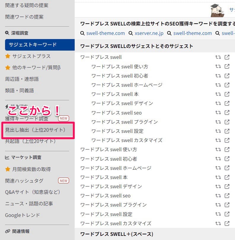 見出しの抽出方法は、左側のメニューバーの「見出し抽出(上位20サイト)」から移動可能です。