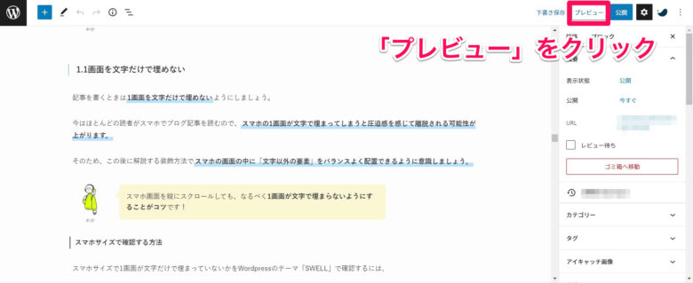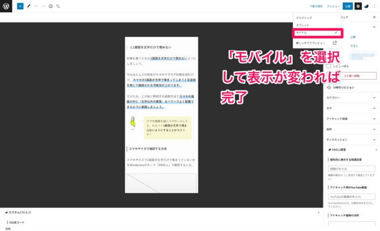 スマホサイズで1画面が文字だけで埋まっていないかをWordpressのテーマ「SWELL」で確認するには、