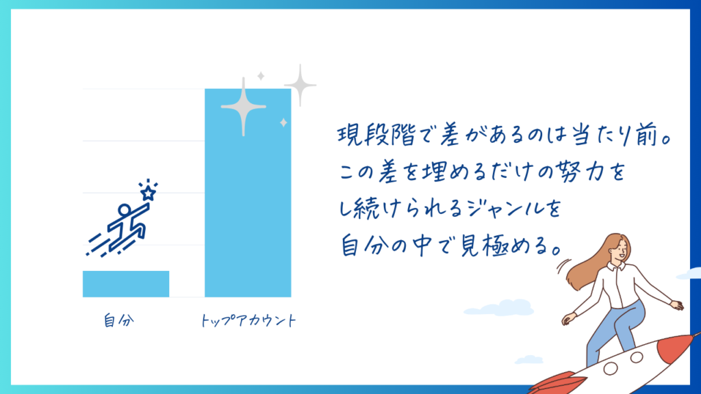 トップアカウントのフォロワー数を確認することで、そのジャンルで「どれくらいまで伸ばせるのか」上限が見えてきます。