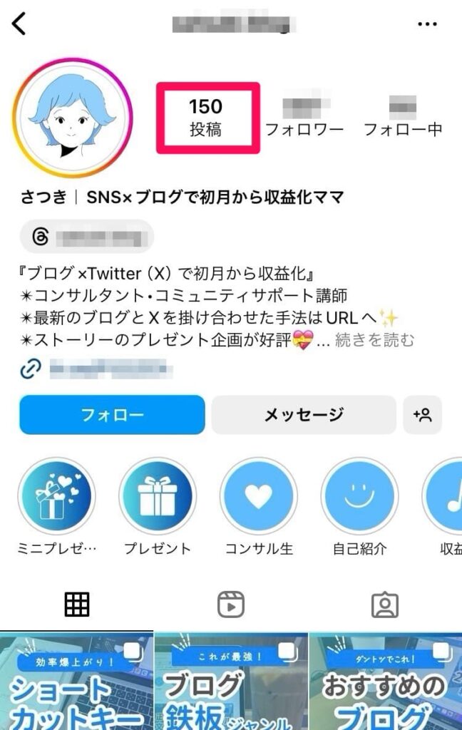Instagramアカウントの投稿数を確認するには、アカウントのフォロワーの左側に記載されています。