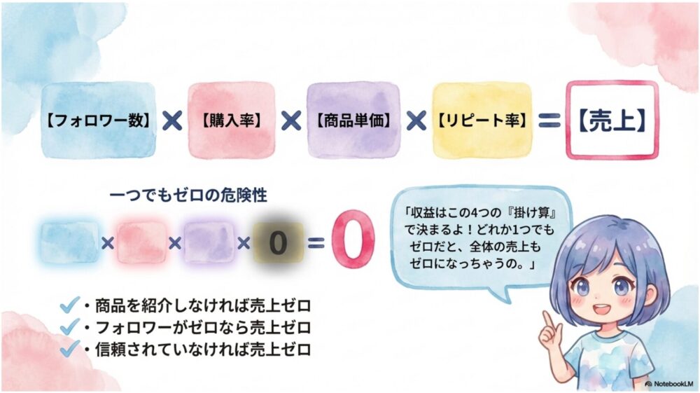 売上 = フォロワー数 × 購入率 × 商品単価 × リピート率