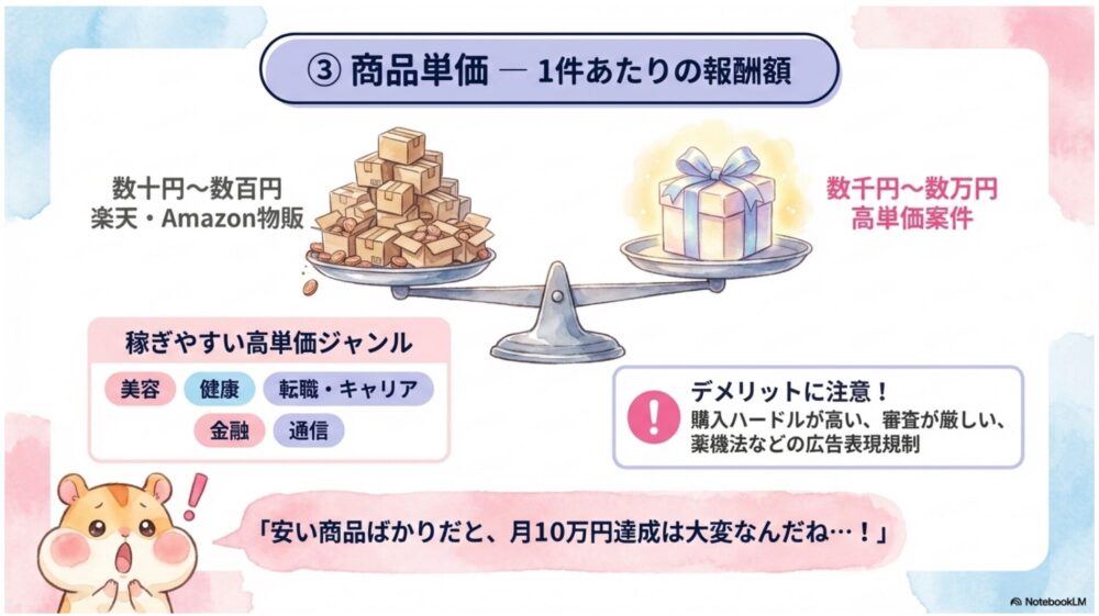 楽天・Amazonの報酬は数十円〜数百円程度が中心になるため、月10万円以上を安定して稼ぎたい場合、物販だけに頼るのは現実的ではありません。
