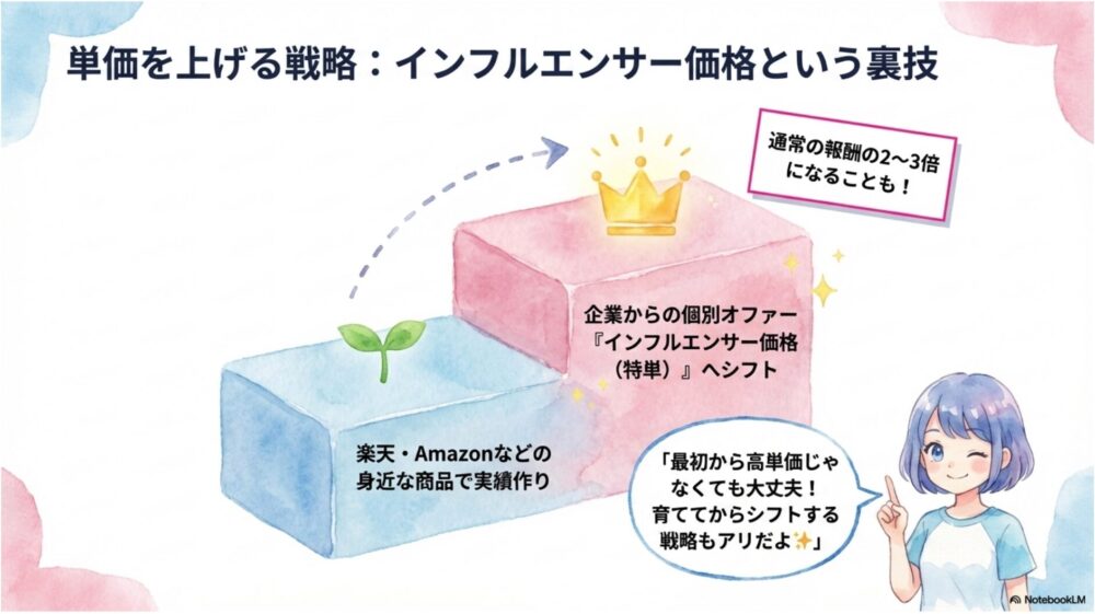 最初は 楽天・Amazonの身近な商品 を紹介して実績を積み、フォロワーが育って企業からインフルエンサー案件が届くようになってから高単価にシフトする、という戦略もアリです!