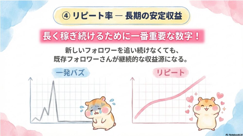 一発バズりで一時的に稼げても、リピート率が低いと翌月からは元通りの収益に戻ってしまいます。