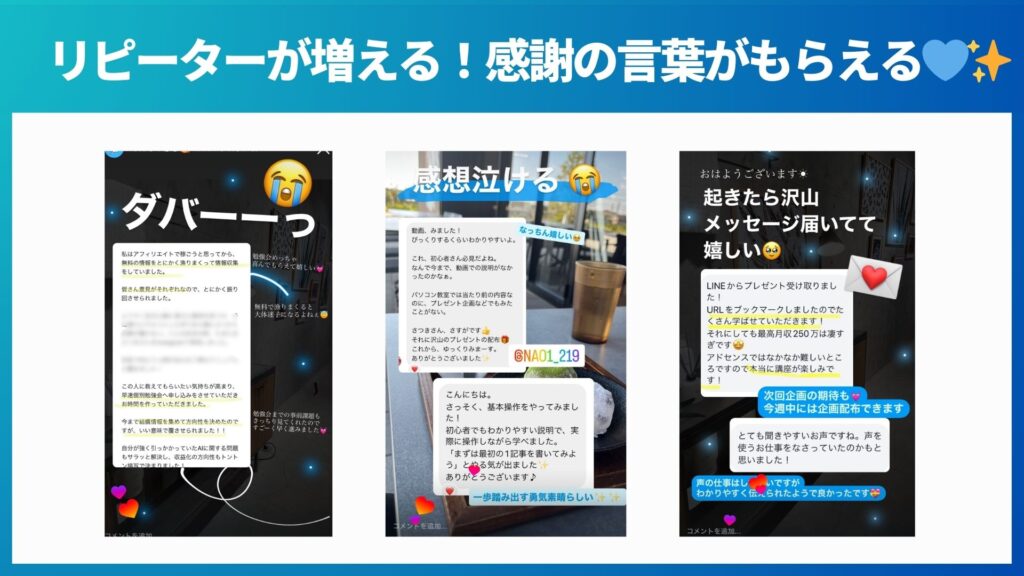 読者さんへの「プレゼント企画」や「アフィリエイト導線」など、より深く価値を届ける仕組みを作っています✨