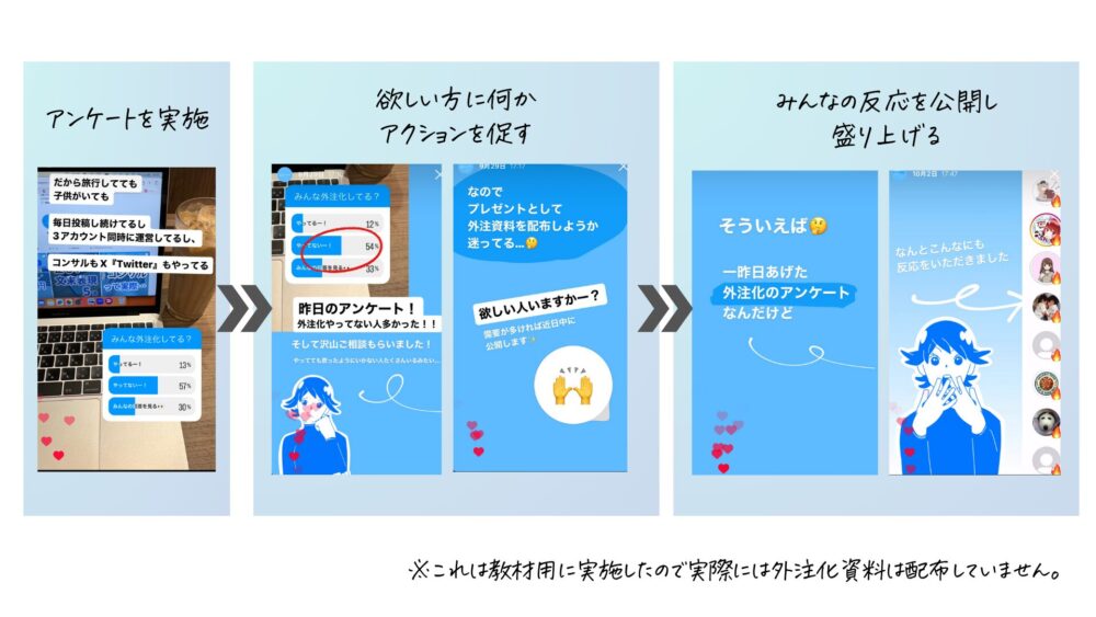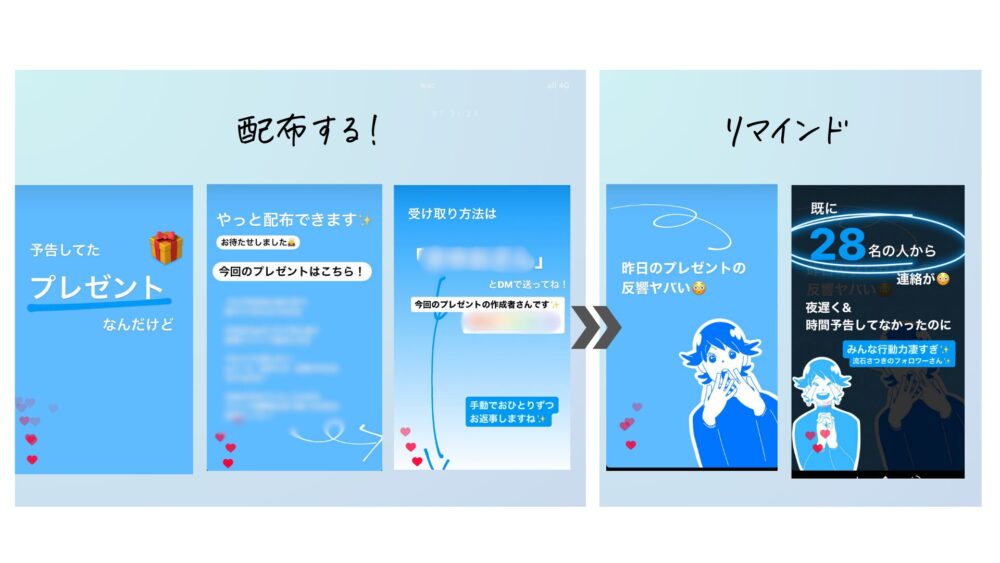 さらにストーリーズで事前にアンケートをとったり、予告を行った上でプレゼントを配布するとより効果が高いです。
