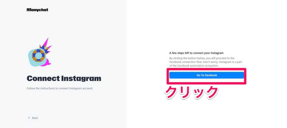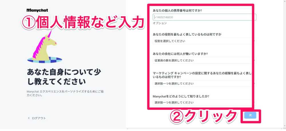 ここではManyChatとFacebook・Instagramを連携するために、いくつか個人情報を入力します。