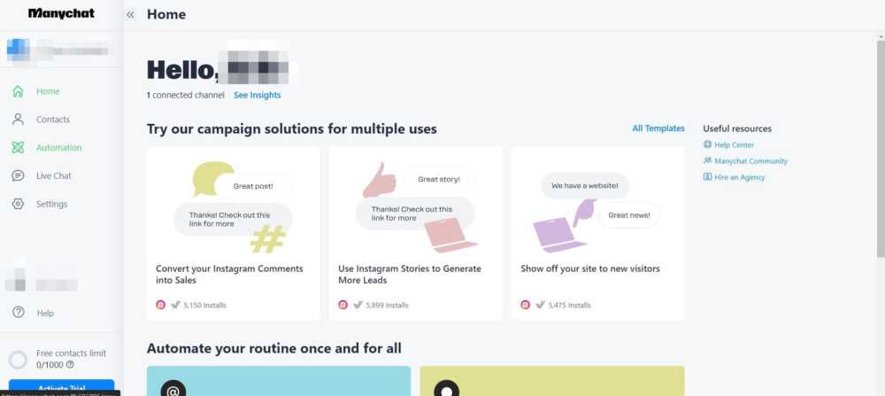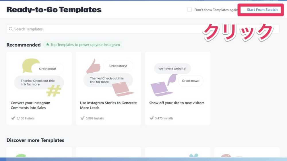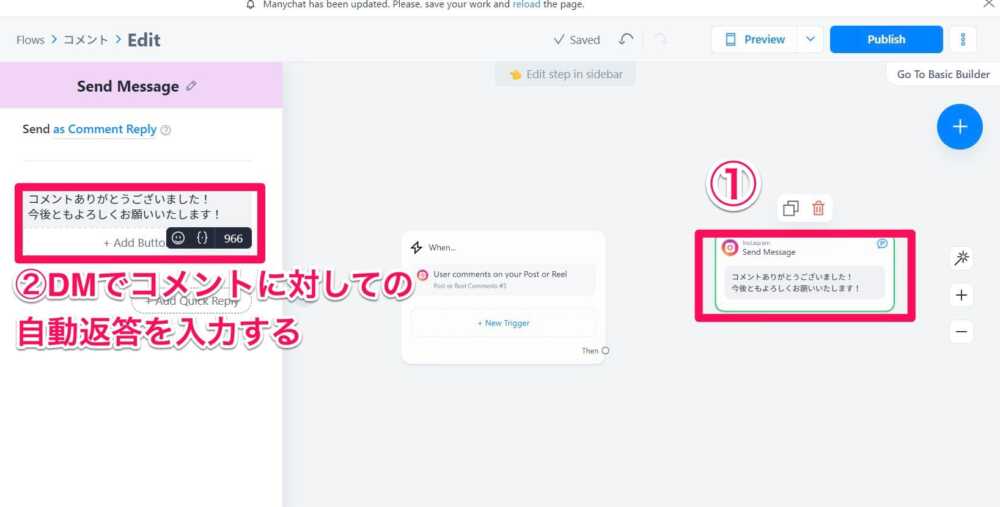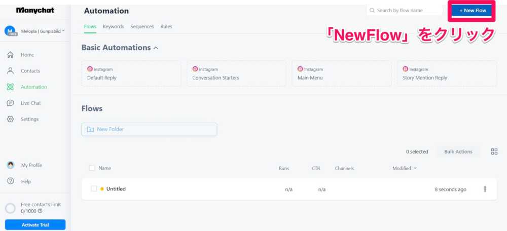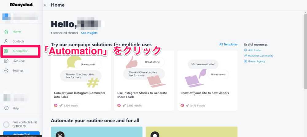 ManyChatのチャットボットを使用するには、Automation(オートメーション)から操作をします。