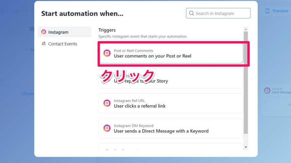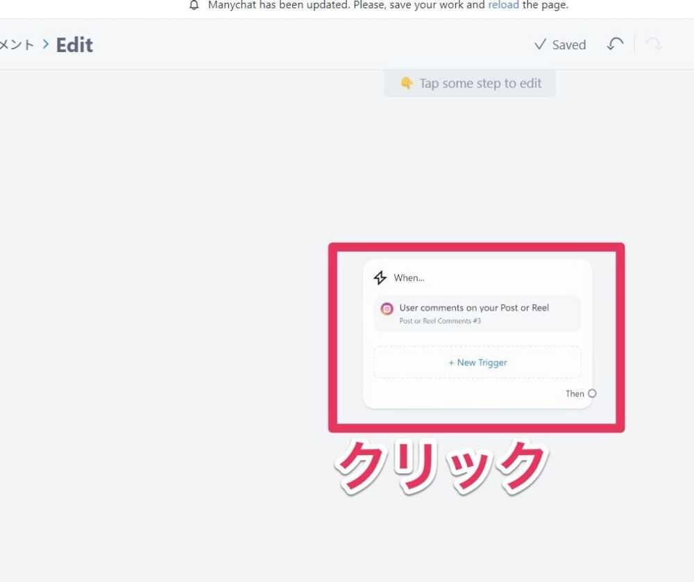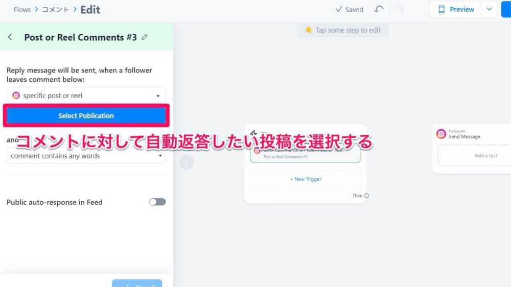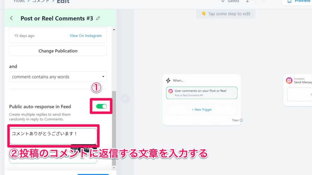 Iステップは先程の動画にあるとおり、企業が配布しているマニュアルやYouTubeなどで操作の解説があるのですが、ManyChatは全く出回っていませんので、こちらで「フィード」または「リール」のコメントから自動返信する方法をご説明します。